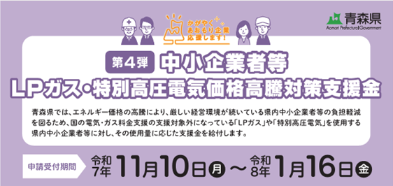 青森県では、エネルギー価格の高騰により、厳しい経営環境が続いている県内中小企業等の負担軽減を図るため、国の電気・ガス料金支援の支援対象外となっている「LPガス」や「特別高圧電気」を使用する県内中小企業等に対し、支援対象期間における使用量に応じた支援金をこれまで3回にわたり給付してきました。